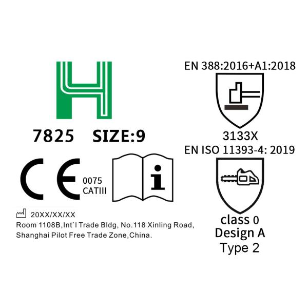CAT III Module B+ Module C2 , Design A (5 finger gloves), type 2 (protective cover only left) and protection class 0 (chain speed up to 16 m / s)