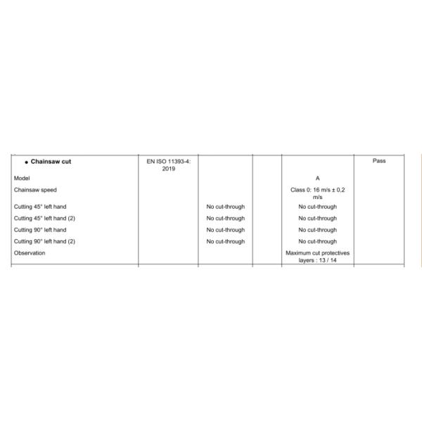 4. Special protective layers in the left hand back, protect against running chainsaw, Type 2, Design A, Class 0 (16 m/s)